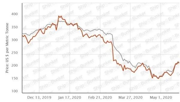 圖4 2019年12月中旬至2020年5月上旬期間,新加坡燃料油IFO380價格(紅線)與北海布倫特原油價格(灰線)比較 來源Ship & Bunker