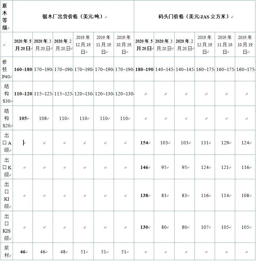 2020年5月,A級新西蘭輻射松(A grade radiata pine)的成本加運費價格(CFR price)回落至每JAS立方米115~120美元,這次的回落僅僅是在一個星期內(nèi)發(fā)生的。中國港口的針葉材(softwood)庫存量為450萬~480萬立方米。中國港口每日原木吞吐量在5萬~6萬立方米之間,而去年同一時期這個數(shù)據(jù)是8萬~9萬立方米。