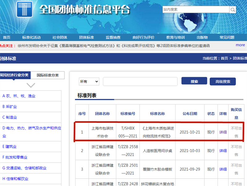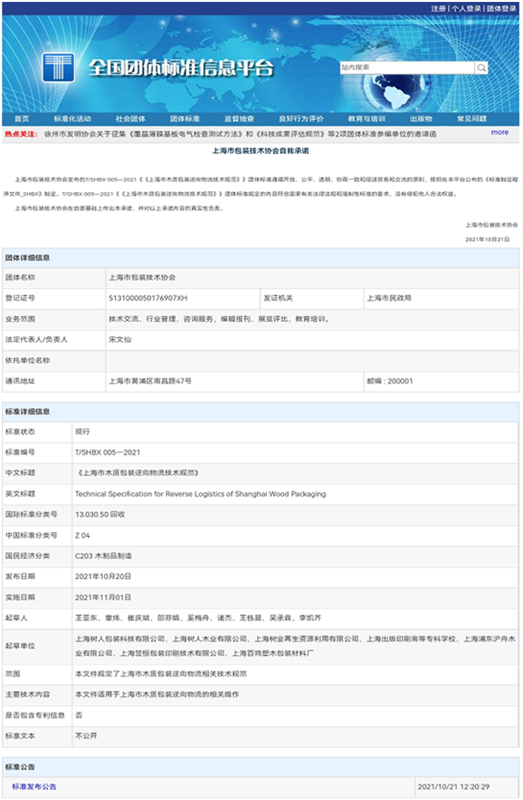 今天,全國團體標(biāo)準(zhǔn)信息平臺發(fā)布了編號為T/SGBX005-2021的“上海市木質(zhì)包裝逆向物流技術(shù)規(guī)范”,這標(biāo)志著由上海樹人包裝科技有限公司會同母公司樹人木業(yè)共同牽頭制訂的這項團標(biāo)得以正式發(fā)布實施。