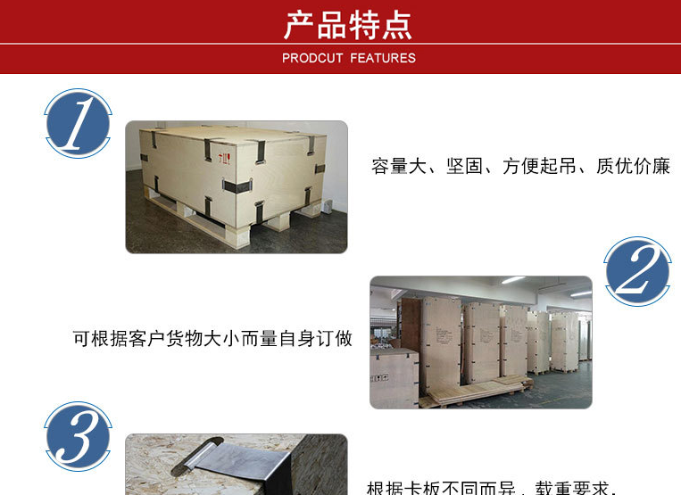 容量大,堅固,方便起吊、質優(yōu)價廉,可根據客戶貨物大小而量身定做,根據卡板不同而異,載重要求,具體規(guī)格,數量由客戶需要而定。